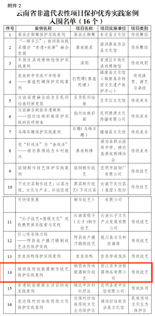 近日,云南省非物质文化遗产保护中心发布2025年“云南省非遗代表性项目保护优秀实践案例”入选(入围)名单公告。百岁坊品牌凭借“纳西族传统银器制作技艺保护实践案例”成功入围。