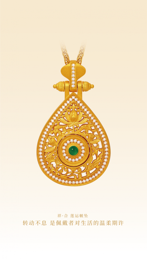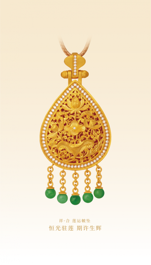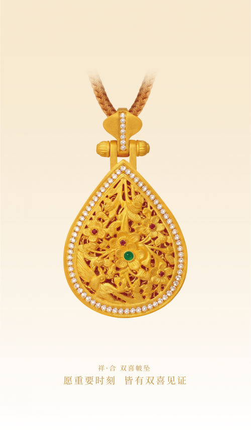 和美金帔系列承宋式美学之魂,蕴藏三大吉祥寓意:同心帔坠,以“交颈同心”寄寓恒久诺言,是为信物;双喜帔坠,承“喜上眉梢”之瑞,寄托美好祝愿;莲运帔坠,借流转莲瓣与璀璨钻石,静诉时来运转之祈盼。全系列将古法花丝、錾刻等非遗技艺,经由现代美学设计语言重新解构与诠释,令古典礼器化身为贴合日常的颈间艺术。设计上化繁为简,线条更为凝练流畅,确保了佩戴时的舒适与灵动。