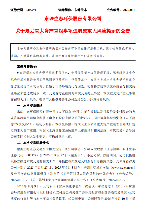 在资本市场方面,东珠生态曾尝试通过重大资产重组寻求转型。公司自2025年8月起筹划以发行股份及支付现金的方式收购凯睿星通信息科技(南京)股份有限公司的控制权。