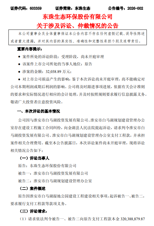 新华日报财经讯 近日,东珠生态环保股份有限公司(证券代码:603359)发布公告,披露其因建设工程施工合同纠纷,向淮安市白马湖投资发展有限公司及淮安市白马湖规划建设管理办公室提起诉讼,要求对方支付工程款本金约3.2亿元并承担诉讼费用。2025年11月25日,该公司还曾披露被中国地质工程集团有限公司起诉,涉案金额高达5.52亿元。而自2025年7月以来,公司新增诉讼累计涉案金额已超过6亿元。