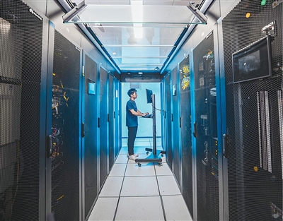 广东横琴粤澳深度合作区内,科研人员在国家新一代类脑人工智能公共算力开放创新平台数据中心机房内调试设备。