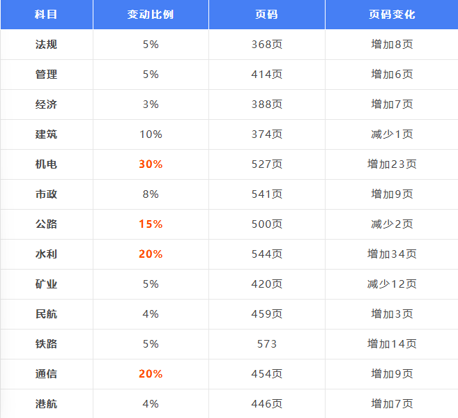 从整体变动幅度来看,不同科目的调整比例存在显著差异。其中机电工程科目变动最为突出,调整比例约达30%,教材页码增加23页;水利水电与通信工程紧随其后,变动比例约为20%。公路工程变动约15%,建筑、市政等科目亦有一定程度的内容更新。