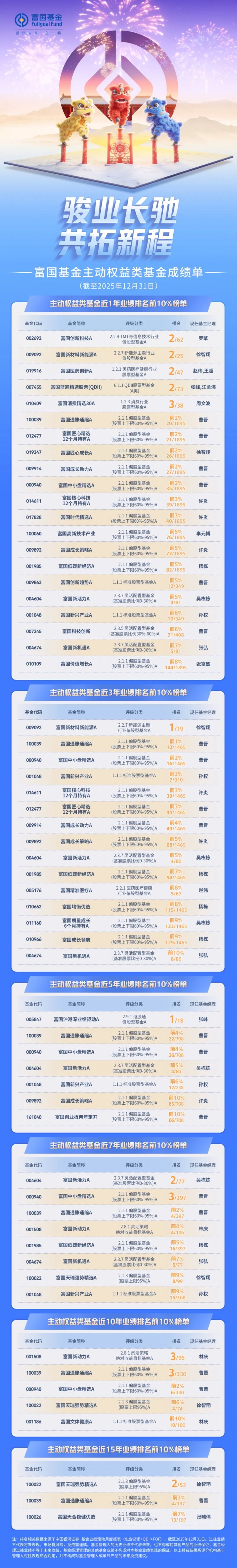 主动管理能力是公募基金的核心竞争力。2025年,富国基金主动权益板块凭借前瞻的产业研究及系统化投研平台,在科技、医药等主线中精准布局,整体表现持续领先。根据银河证券数据,截至2025年12月31日,富二家旗下22只主动权益产品近一年业绩稳居同类前10%,其中2只位列第一,共有12只产品排名居前三。国泰海通证券统计显示,富国基金近三年权益类主动管理收益率在13家大型公募中排名第2。