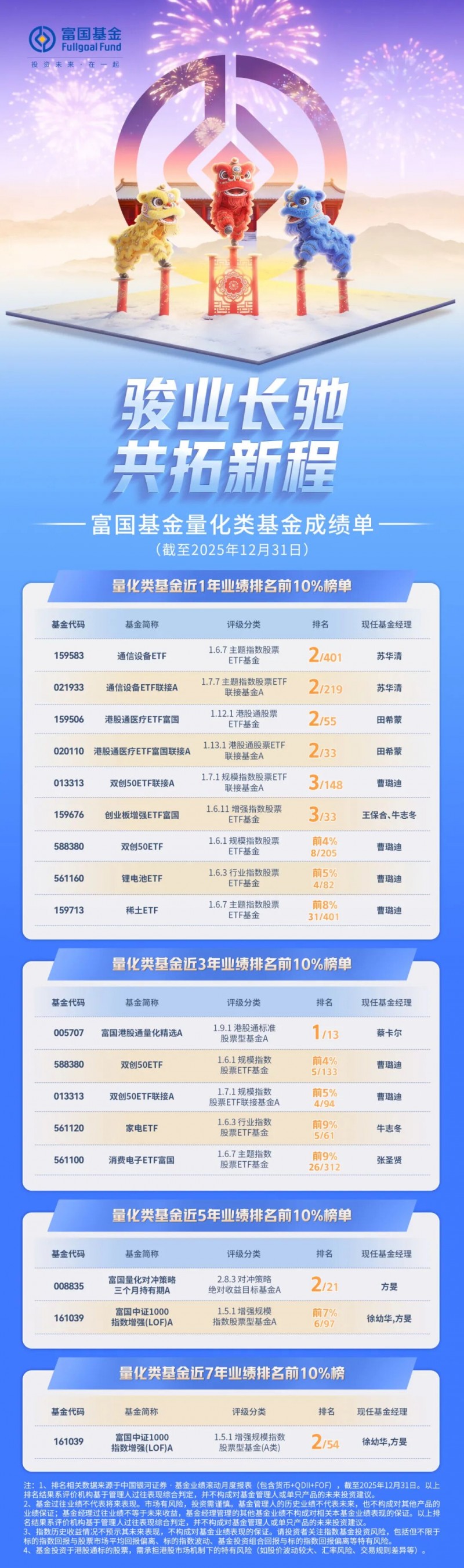 回顾2025,是富国基金与每一位投资者并肩前行的一年,也是“深入研究+长期主义”再一次被验证的一年。无论是抓住科技浪潮的富国科技绩优团,在债市波动中踏浪前行的固收团队,还是引领指数化投资的量化先锋,都离不开客官的信任与陪伴。