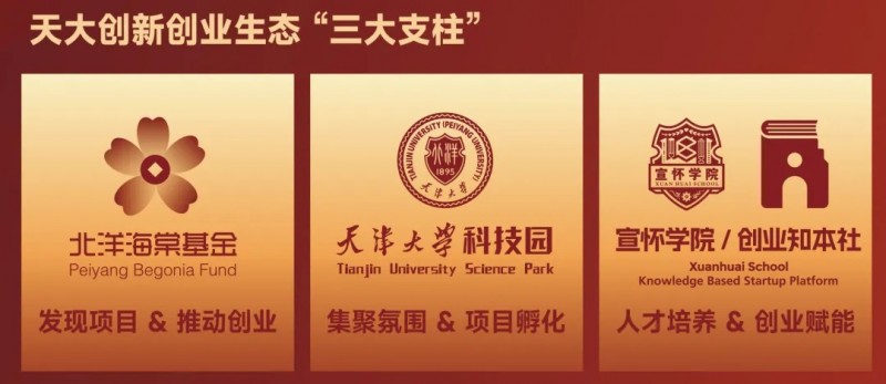 为加速科技成果转化进程,助力科技成果转化跨越“达尔文死海”。天津大学宣怀学院与北洋海棠基金、天津大学科技园、创业知本社,共同组成协同共振的创新创业生态“三大支柱”,并构建了一套完整的创新创业生态体系,涵盖创投基金群、创业大讲堂、创新创业论坛、创新创业课程、创业大赛、创业加速营、创业家俱乐部、科技成果转化奖及天津大学科技园,形成了“天大模式”的创新创业生态闭环。