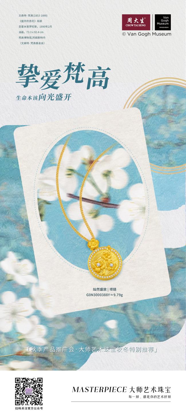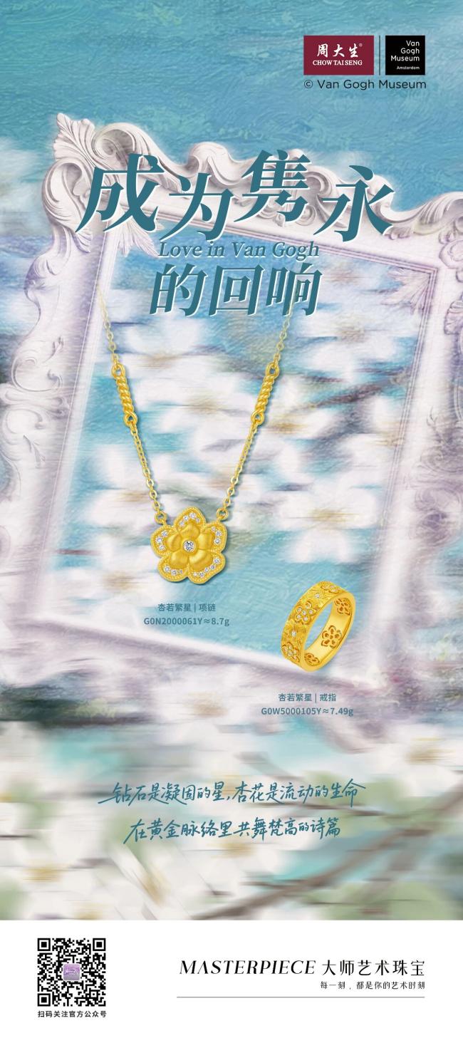 周大生大师艺术珠宝梵高Van Gogh系列,不只是对大师画作的简单复刻,更是对其艺术精神的传承与延续。从向日葵的炽热到杏花的清新,从立体雕刻的肌理,到渐变珐琅的光影,每一处细节无不体现对梵高艺术的致敬与对实用佩戴需求的考量。它打破了西方经典艺术与现代生活的壁垒,让梵高笔下的生命热忱与自然之美,化为可触摸、可佩戴的珠宝形态,让原本多用于鉴赏的经典艺术,走出展厅,成为融入日常穿搭的配饰,成为人人可感、可佩戴的生活诗篇。