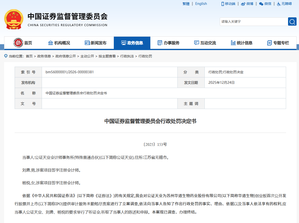 新华日报财经讯 近日,中国证监会官网发布行政处罚决定,对公证天业会计师事务所(特殊普通合伙)为苏州华道生物药业股份有限公司创业板首次公开发行股票并上市提供审计服务未勤勉尽责案作出处理。经查明,公证天业在为华道生物IPO提供的审计报告存在虚假记载,审计过程中未勤勉尽责。
