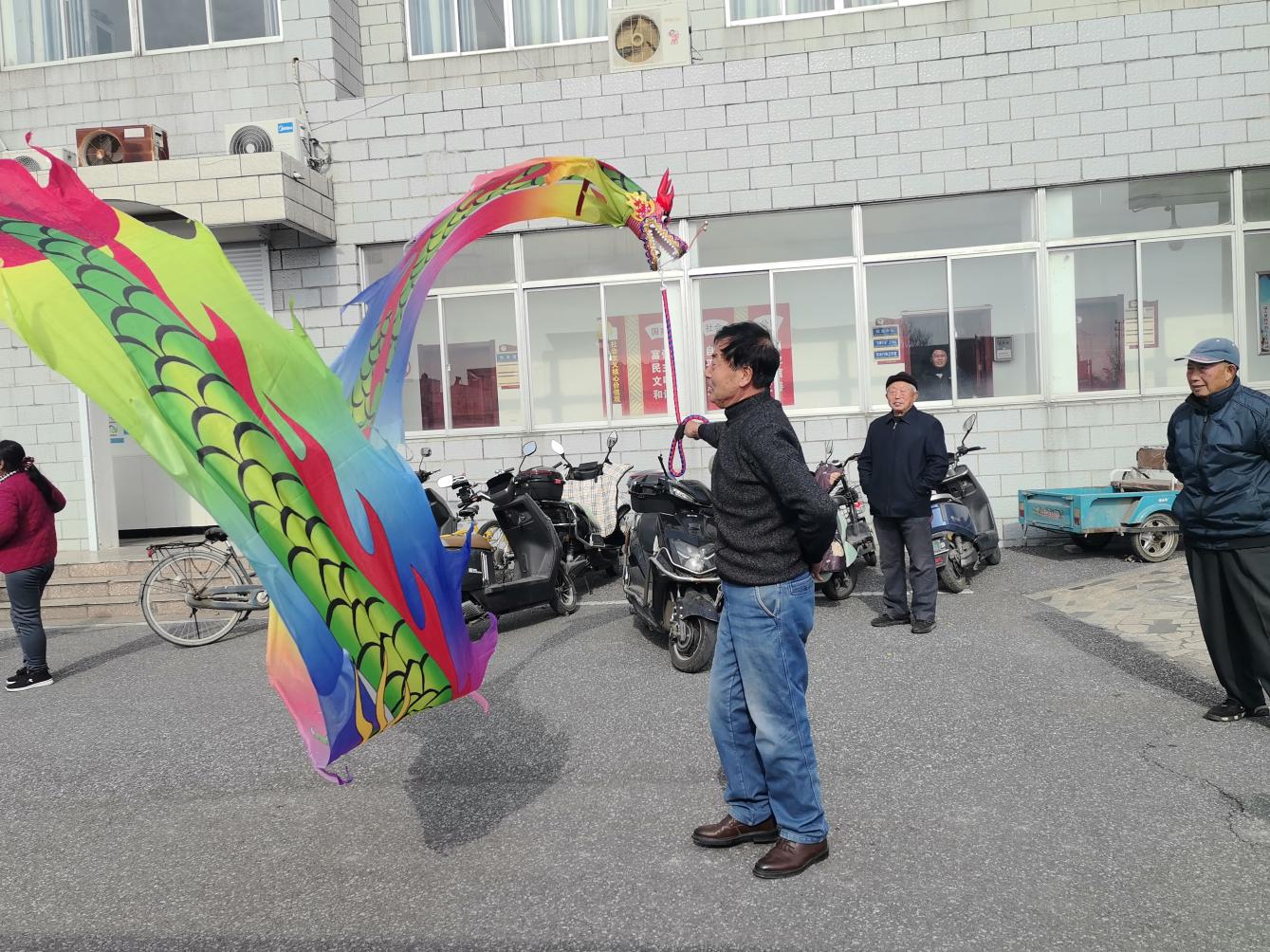 欢声笑语舞彩龙,乐享银龄新生活。为满足社区中老年群体的健身需求,河失镇新联会邀请专业教练开展鞭陀龙技艺培训,将文体课堂搬到了“家门口”。活动现场,大家精神抖擞地围成半圆,专注聆听教练讲解鞭陀龙的动作要领,教练手把手示范,传授“握杆要稳、转腕要巧、腰随龙走”的技巧。随着欢快音乐响起,彩龙在老人手中渐次腾跃——起初略显生涩,继而舒展流畅,红黄蓝紫的龙身翻飞如浪,时而昂首穿云,时而低旋戏风。银发与彩绸共舞,笑语伴鼓点齐飞。这场寓学于乐的培训,让“老有所学”化作冬日里最温暖的收获。