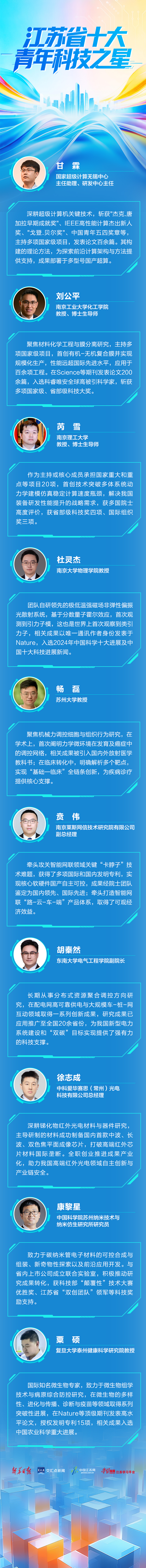 此次10位获奖者平均年龄约37岁,其中最小者为“90后”。为什么是他们摘得如此高“含金量”的奖项?分析其科技创新成果不难发现,核心在于三点:一是成果硬核,或实现国际首创,或打破技术垄断,多项达国际领先水平;二是领域关键,聚焦生物医药、物理学、计算机信息、新材料等前沿赛道,直击关键技术难题;三是贡献突出,兼具学术突破与产业转化价值,契合江苏新质生产力发展需求。让我们来看看他们的创新成果——