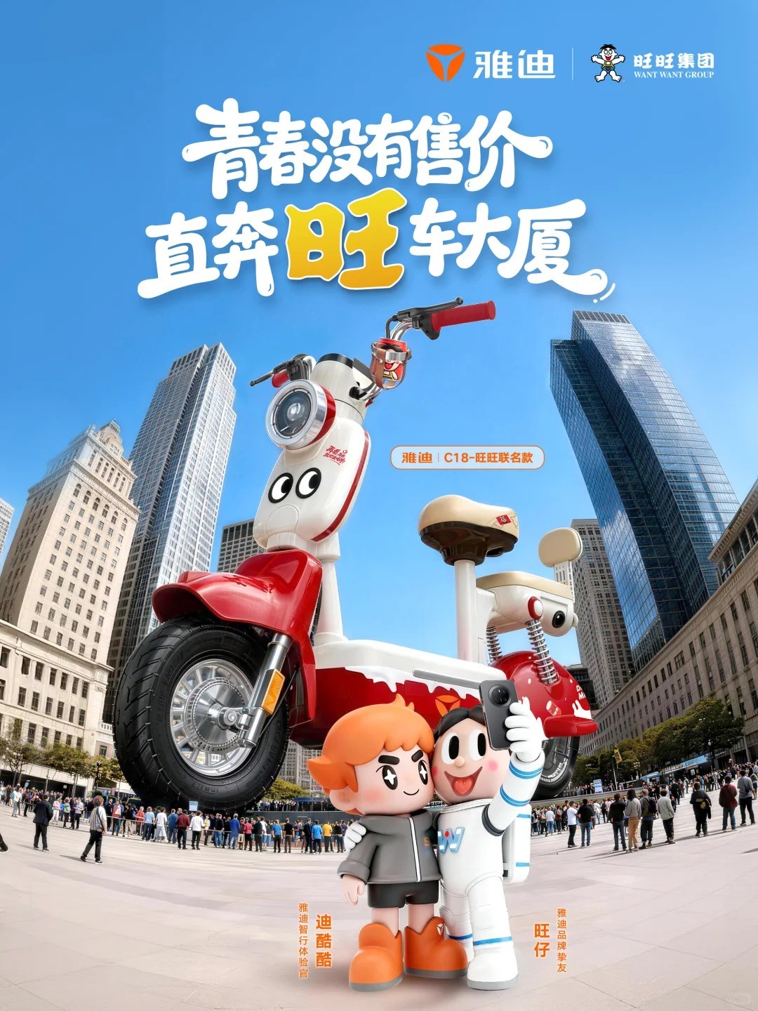 新年伊始,雅迪携手“童年ICON”旺旺联名造车。作为各自领域的“顶流”,雅迪与旺旺的“跨次元壁”合作瞬间吸引了大众的视野,联名车更是传递出对新年好运的祝福巧思,红白的旺旺经典配色、“旺”字迎宾灯等都传递着新年的喜庆氛围,为用户送上新年“旺上加旺”的美好祝福。