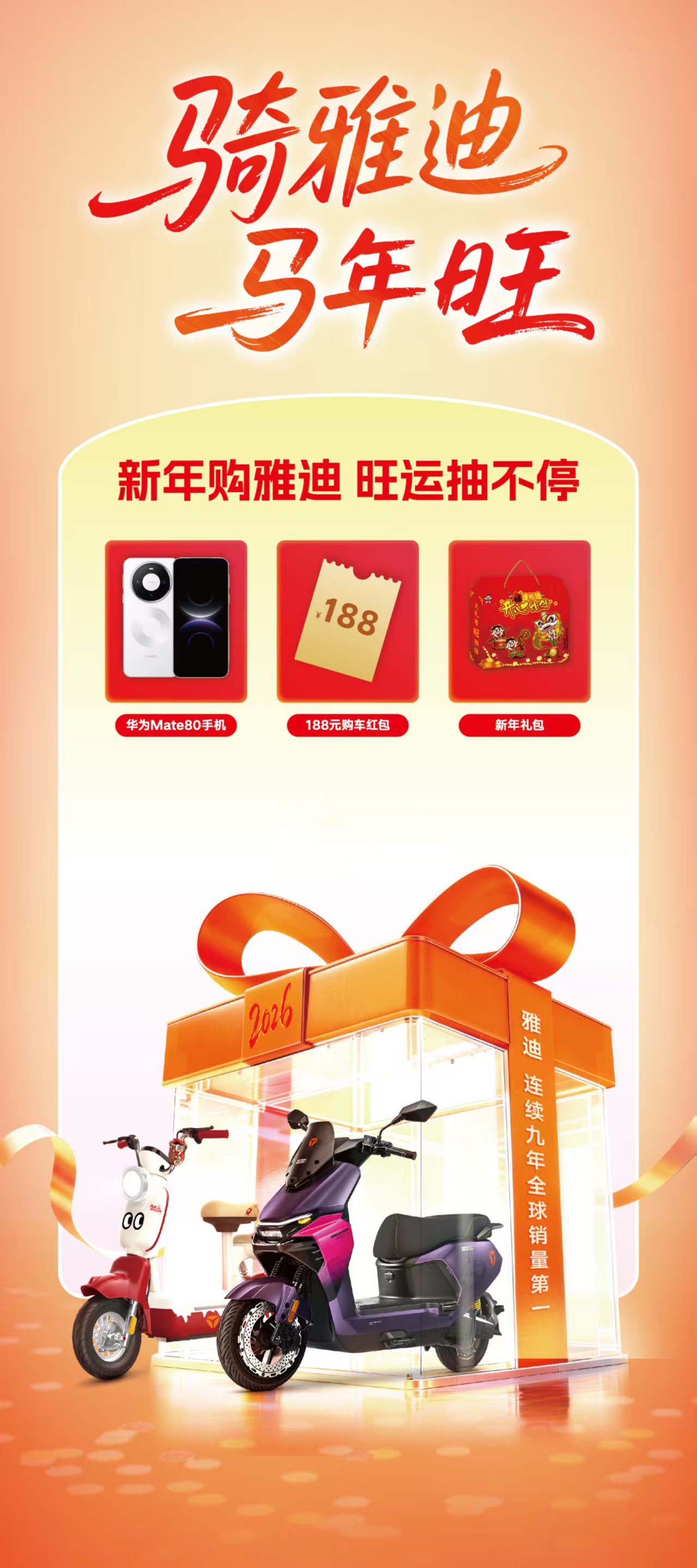 与此同时,宠粉的雅迪更是将大家的新年期盼真正变成触手可及的惊喜,新年好运祝福礼包准备就绪。1月15日起,在全国40000+雅迪门店中,雅迪新年旺运礼包限时放送*,祝福大家新的一年“财运旺”“事业旺”“家庭旺”,每份旺气中还包含着一份雅迪准备的新年奖品:华为Mate80手机、购车红包、新年礼包,100%的中奖率为“好好爱自己”的新年愿望送来回应。