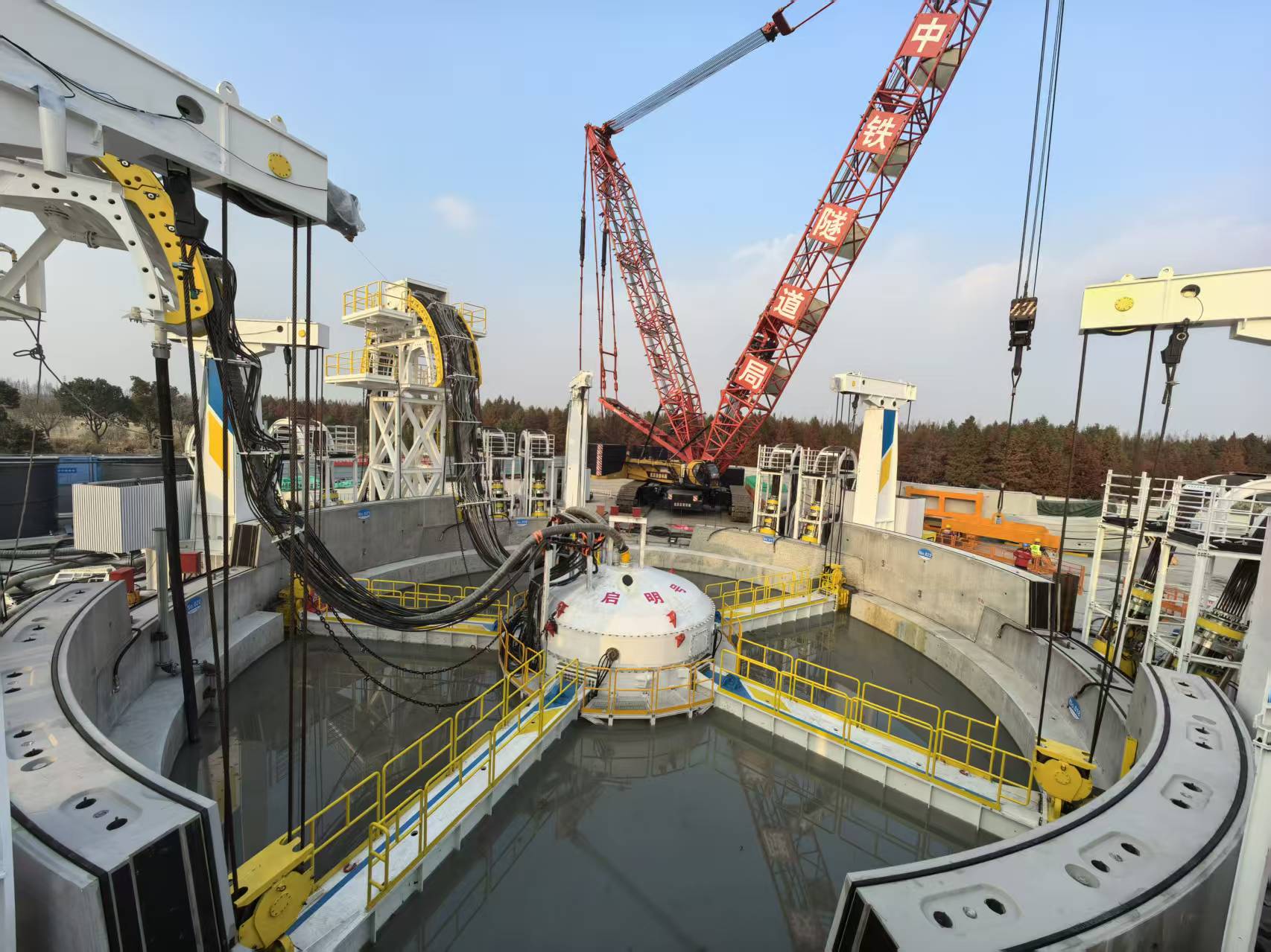 为安全、快速、优质建成2号竖井,项目团队首次采用水下全自动机械式竖井掘进机(VSM)——崇太长江隧道“启明号”进行施工。该掘进机开挖直径24米,主机高约13米,最大开挖深度75米,承受水压8ber,是我国自主研制的世界最大直径竖井掘进机。