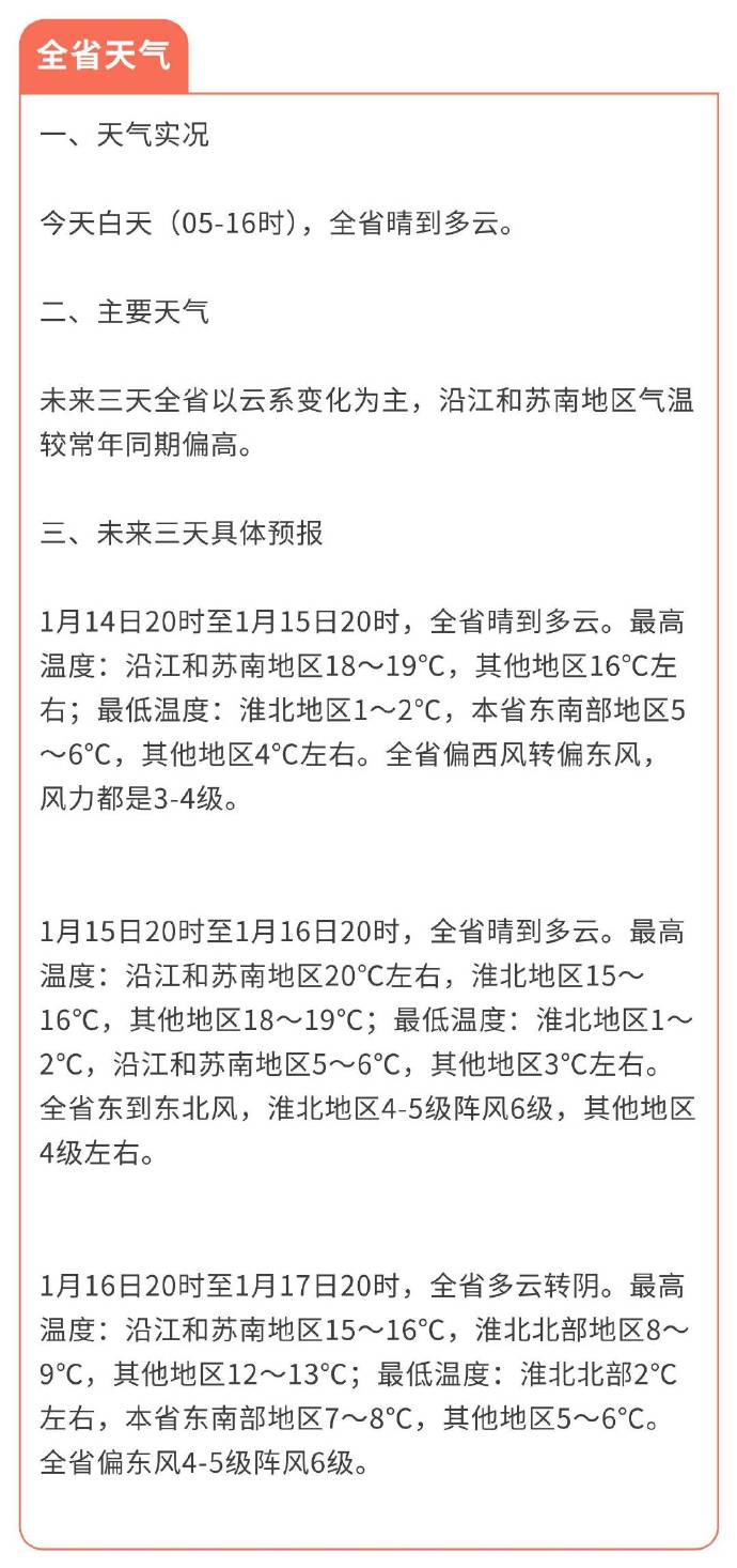 不过这波暖意并不能持续太久,气温即将上演“过山车”式起伏。根据江苏省气象台的预报,未来三天全省以云系变化为主,沿江和苏南地区气温较常年同期明显偏高。1月14日20时至1月15日20时,全省晴到多云,最高温度沿江和苏南地区18~19℃,其他地区16℃左右;最低温度淮北地区1~2℃,本省东南部地区5~6℃,其他地区4℃左右,全省偏西风转偏东风,风力都是3-4级。