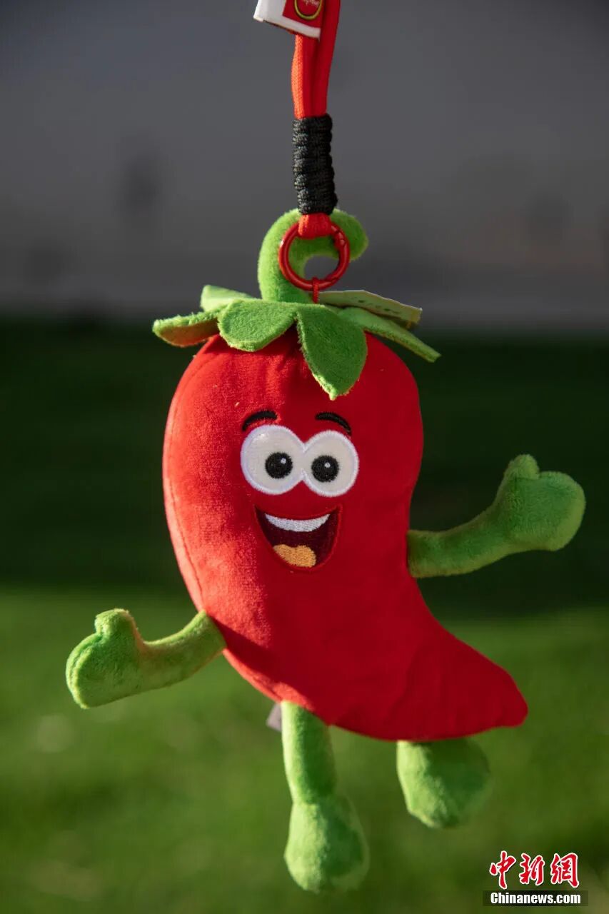 文创摊位上,红红的小辣椒有着绿色的“帽子”和四肢,它咧着嘴笑想和人们“椒”个朋友,手脚向外伸展,好像正在欢快地跳跃。
