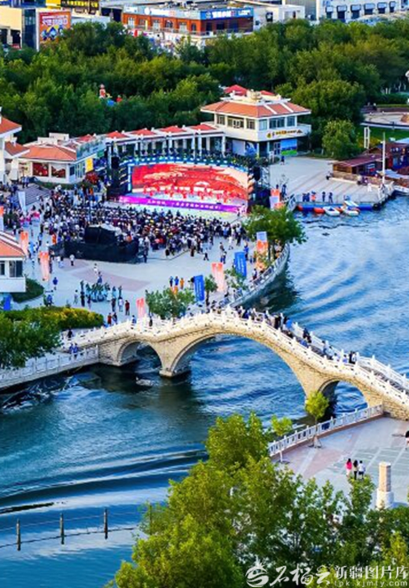克拉玛依河景区华灯初上、夜景璀璨,吸引了众多纳凉的市民和游客驻足观赏(2025年7月24日摄)。 闵勇摄