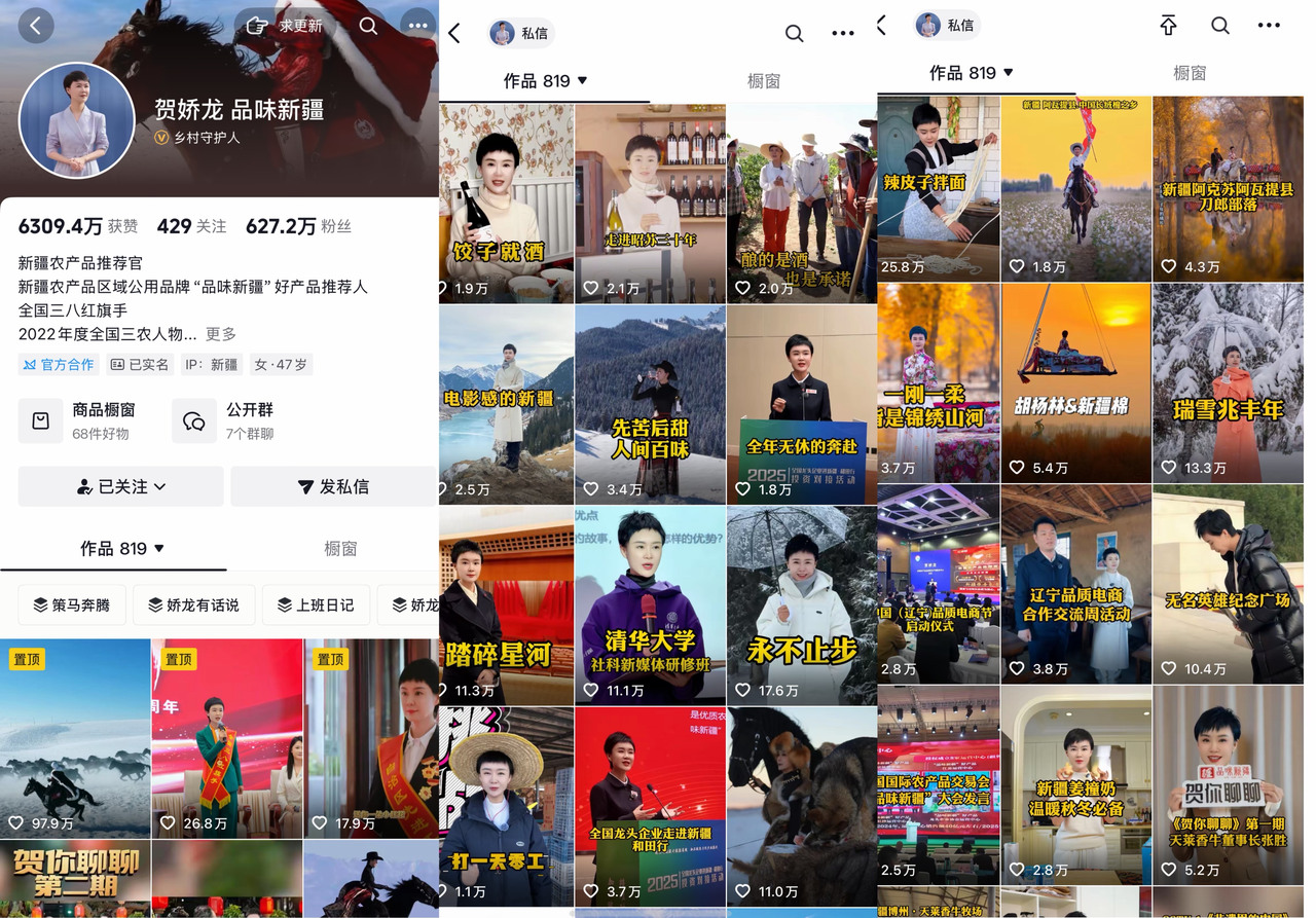 而这份奔走,始终聚焦在“把新疆好东西带出去”——在“贺娇龙 品味新疆”账号的橱窗里,挂着新疆天山羊绒、库尔勒香梨、棉花被、玫瑰花油、昭苏菜籽油、大枣、葡萄干等数十样土特产。