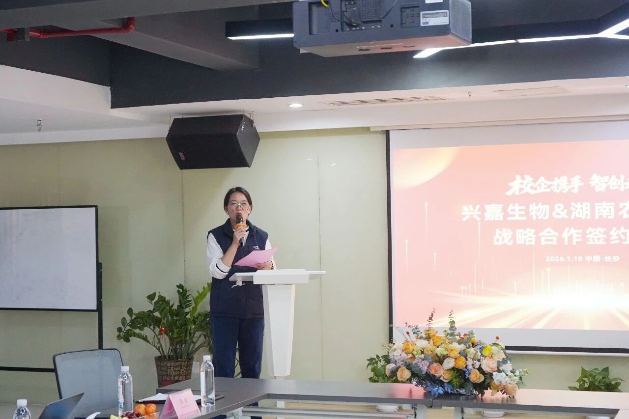 兴嘉生物副总经理陈晓明、总经理助理方晶子,湖南农业大学动科院副院长何俊等双方代表出席仪式,兴嘉生物产品线总监陈娟博士担任仪式主持。