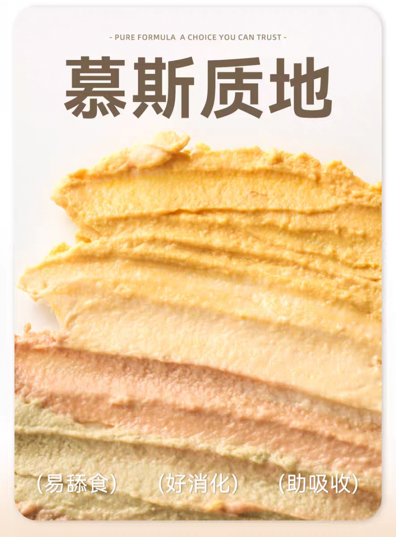 猫咪在舔食柔软绵密的奶层时,能轻松获得极易吸收的优质乳蛋白与脂肪;当它们品尝到下层的肉类与果蔬混合层时,则满足了撕咬和咀嚼的口感需求,摄入动物蛋白与膳食纤维。一餐之中,两种截然不同的口感体验交替进行,让日常进食变成充满乐趣的探索,有效解决挑食问题,自然而然地增加进食量。