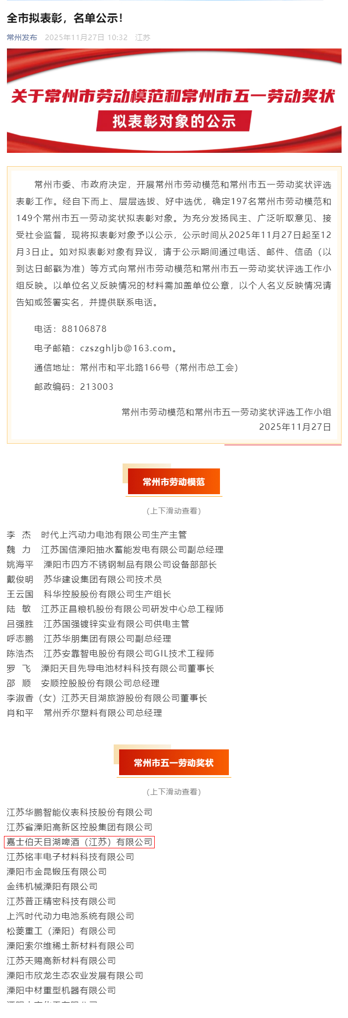 近日,常州市委、市政府公布2025年五一劳动奖状认定名单。嘉士伯天目湖啤酒(江苏)有限公司(以下简称“天目湖酒厂”)凭借在高质量发展及绿色智能制造方面的系统化实践,荣获“常州市五一劳动奖状”。