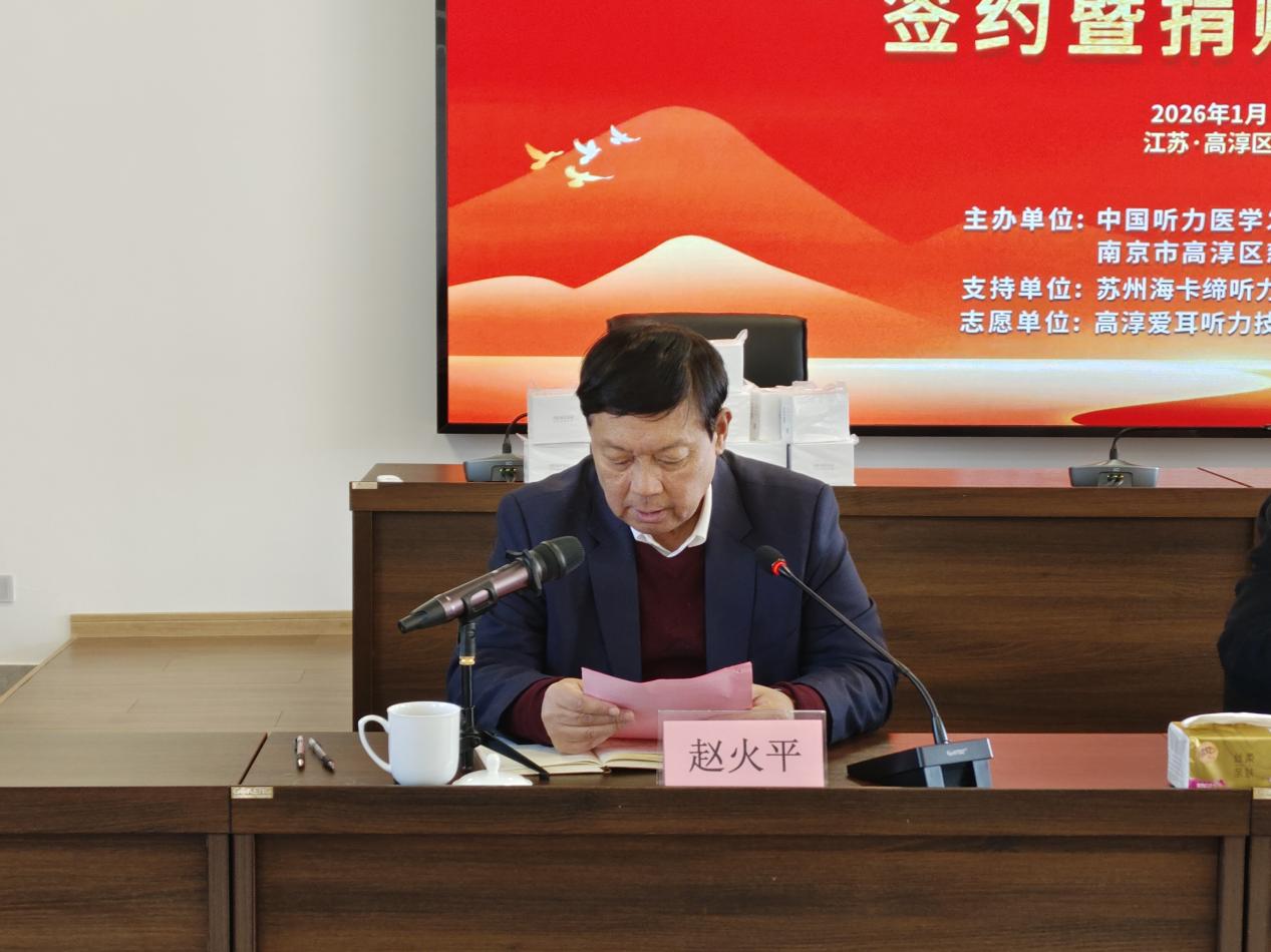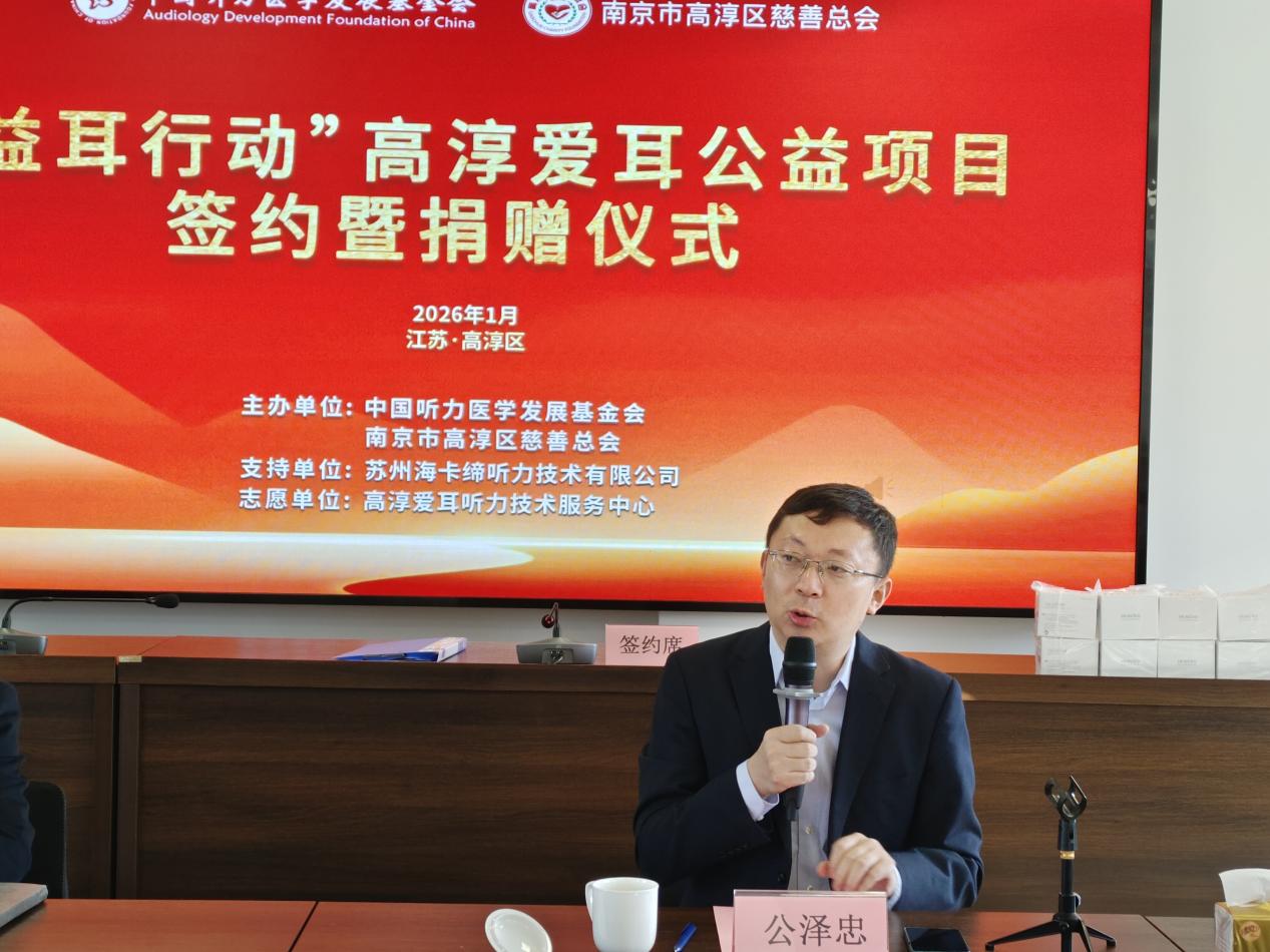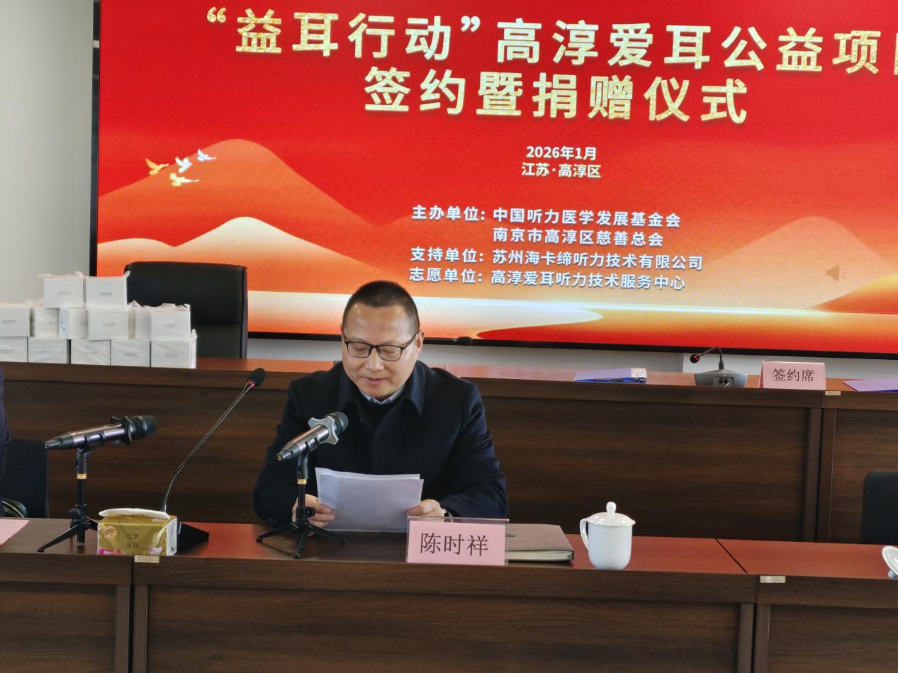 1月15日,捐赠仪式在高淳区固城街道禅林山村隆重举行。中国听力医学发展基金会副理事长兼秘书长公泽忠、副区长陈时祥、区慈善总会主要负责人赵火平、固城街道办事处主任孔维新、副主任孙贤长、苏州海卡缔听力技术有限公司总经理顾祎参加捐赠仪式并分别致辞、讲话。中国听力医学发展基金会执行副秘书长甄丽霞,助理秘书长齐晓乐、区慈善总会原会长孔德华、区民政局负责人李明、各街镇慈善协会会长和10名重度听障患者共同见证这份惠及桑梓的善举落地生根。捐赠仪式由一级调研员、区慈善总会办公室主任陈晓华主持。