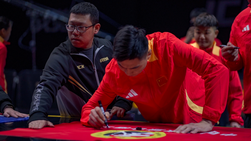 仪式现场,队员们精神饱满,有序领取了代表国家荣誉的参赛装备。在随后的签名环节中,每一位运动员都在队旗上认真留下了自己的名字,象征着对团队的承诺和对国家的责任。合影时,队员们齐声喊出出征口号,铿锵有力的誓言在训练中心回荡,充分彰显了全队团结一心、力争佳绩的信心与气势。