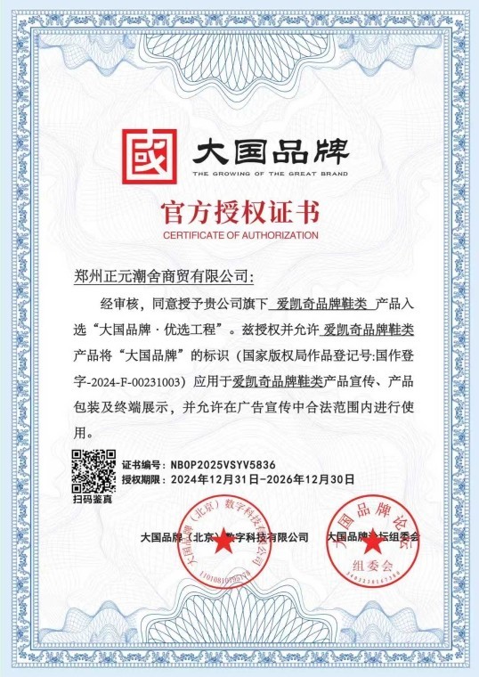 此次爱凯奇再度获授“大国品牌”标识(国家版权局作品登记号:国作登字-2024-F-00231003),并获准应用于品牌鞋类产品的宣传、包装及终端展示,背后是其多年如一日对“品质生命线”的坚守和对科技创新的不懈追求。