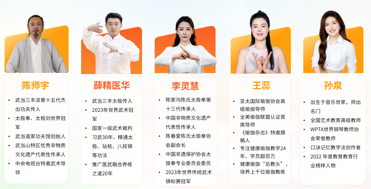简橙教育平台还汇聚了太极、瑜伽、音乐等多元领域的资深专家:太极课程分别由陈家沟陈氏太极拳第十三代传人灵儿老师、武当三丰派第十五代杰出功夫传人陈师宇、武当三丰太极传人薛精医华亲授;瑜伽课程由亚太国际瑜伽协会高级瑜伽导师王蕊老师负责;钢琴教学由全国艺术教育高级教师孙泉当首席老师。教学团队以科学体系为基础,通过结构化课程与个性化指导,助力学员实现身心与技能的同步提升。