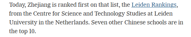 文章指出,根据荷兰莱顿大学科学与技术研究中心发布的“莱顿大学排名”(一个依照文献计量指标建立的全球大学排名系统),哈佛大学排名降至第三位,同时其他美国大学与全球顶尖学府的差距正在扩大。文章强调,排名正在快速上升的学校是那些强调科研产出数量与质量的中国高校。“莱顿大学排名”显示,中国浙江大学位居榜首,此外还有七所中国高校进入前十名。一些资深学者认为,这些排名反映出中国科研成果的显著增长,并警告称美国正在逐渐落后。