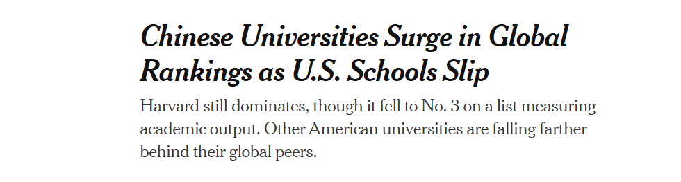 美国《纽约时报》15日发表文章称,在综合考量高校学术出版成果的全球排名中,哈佛大学曾是全球科研成果最丰硕的大学,然而该高校这一地位正摇摇欲坠。与此同时,中国高校的全球排名却正在飙升。这一趋势引发美国学术界担忧。