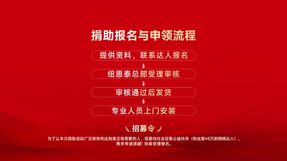 帮扶对象面向河北全域困难家庭,涵盖低保户、五保户、残疾人家庭、孤寡老人家庭、军烈属、见义勇为等群体。为让帮扶精准触达更多有需要的家庭,纽恩泰同步发出公益伙伴征集令,呼吁社会各界爱心人士成为公益传递伙伴,协助发现并推荐困难家庭,扩大帮扶覆盖面。