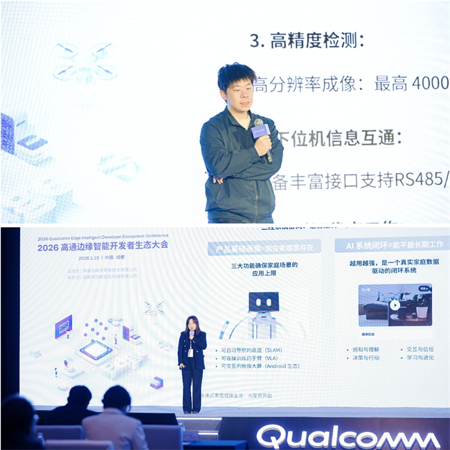 大会不仅聚焦前沿趋势,更注重呈现产业协同带来的实际价值。在案例分享环节,来自制造业的龙头企业格力电器及海尔集团成员企业星炽动力,各自分享高通边缘算力在工业质检与服务康养机器人场景中的规模化应用案例。随后,ROS专家赵虚左结合行业实践,进一步阐释相关技术研发与应用要点。