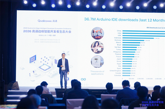 随后,高通公司全球副总裁兼Arduino业务总经理、前Arduino CEO Fabio Violante 围绕开发者生态与平台支持体系进行了分享。他表示,边缘计算与终端侧 AI 正快速发展,这要求开发平台不仅要易用,也要具备可扩展性与专业级能力。围绕这一趋势,Arduino 正通过覆盖软硬件的一体化平台能力,将 AI 能力引入更多终端与物理场景,支持从原型验证到产业级部署的完整路径,并通过持续完善开发工具、操作系统支持以及云端与本地协同能力,帮助开发者更高效地构建和部署边缘 AI 应用。