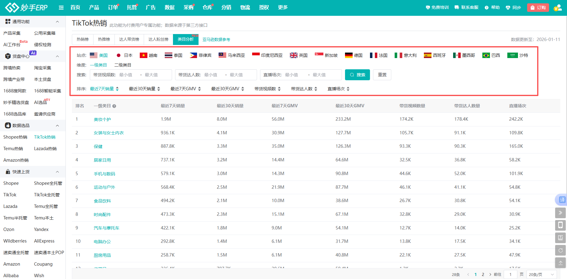 打造爆品的基础在于“选对赛道”。在确定具体产品前,筛选高潜品类是关键一步。卖家可借助妙手【TikTok热销】-【类目分析】功能,快速查看TikTok Shop各站点一二级类目榜单。