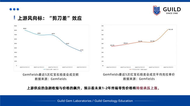 在本届GALA盛典上,吉尔德宝石实验室彩宝部主任李凯首先指出:2025年彩色宝石市场正经历转型,消费者不再仅关注单一标签,而是综合考量颜色、晶体、切工与光效,推动市场聚焦高品质与多元审美。红宝石供给依旧稀缺,从近5次的Gemfields拍卖数据显示红宝石成交量下降,原石价格上涨。红宝石中“鸽血红”色仍然主导市场,审美偏好呈现多元化趋势,2克拉以下红宝石占主流,2克拉以上高品质红宝石保持稳定,缅甸与莫桑比克占据核心产地地位。