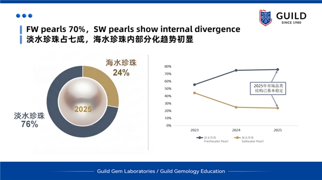 从品类结构来看,与2024年相比淡水和海水珍珠两者的市场占比基本稳定,淡水珍珠占比为76%,海水珍珠为24%,与全球的产量结构一致。但在海水珍珠的内部,呈现出南洋珍珠增长10%、Akoya珍珠回调11%及大溪地珍珠比例保持稳定的态势,数据的背后非短期审美变化,而是与养殖周期、产量约束以及价格体系的稳定性密切相关,高稀缺品类在当下环境更具韧性。
