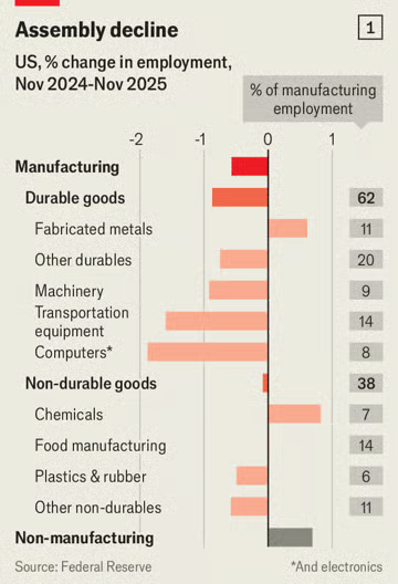 《经济学人》网站报道指出,数据显示,美国制造业收缩已进入第三年,截至2025年11月的工厂年度就业率下降了 0.6% 。这并非外部因素的孤立影响,而是关税政策直接导致的负面效应。