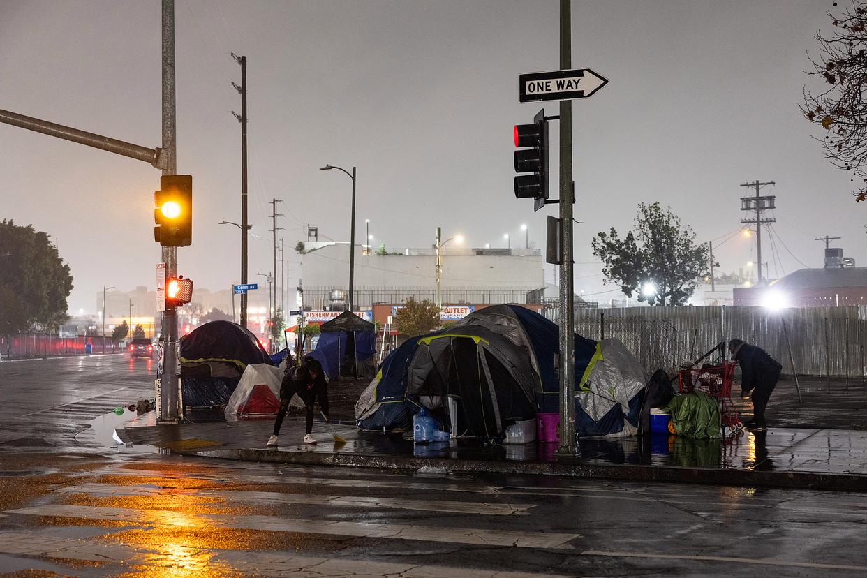 新年伊始,在美国加利福尼亚州洛杉矶市中心,大量流浪汉露宿街头。他们衣着单薄、神情呆滞,排队领取救济食品。