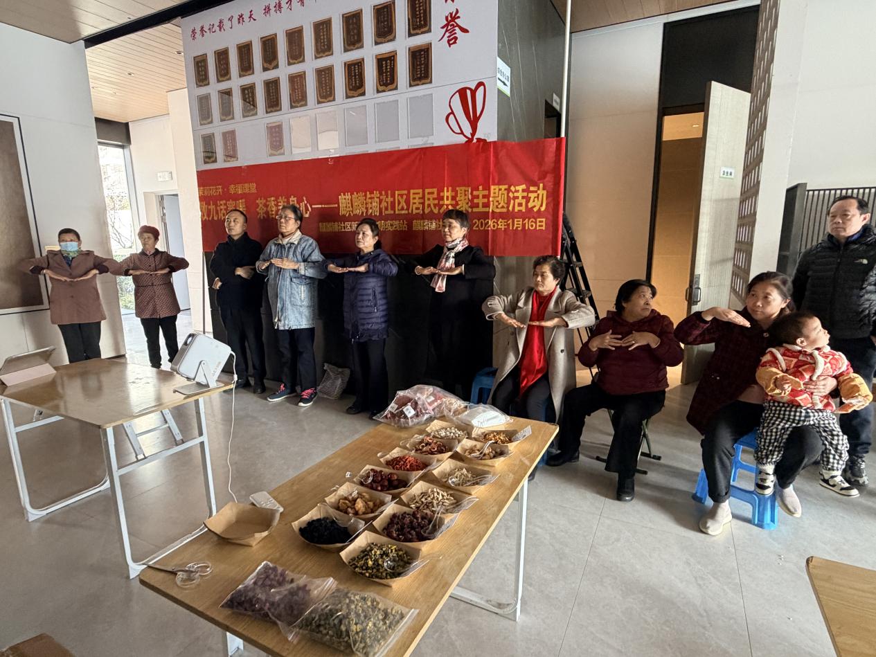 随后的“坐式八段锦”跟练环节结合了冬季“养藏为主”的节气特点,居民们跟随节奏完成一组动作舒缓、易于上手的八段锦练习。整个过程不强调动作规范,更注重呼吸配合与身体感受,让参与者在缓慢伸展中逐渐放松身心,为后续活动营造平稳安定的氛围。