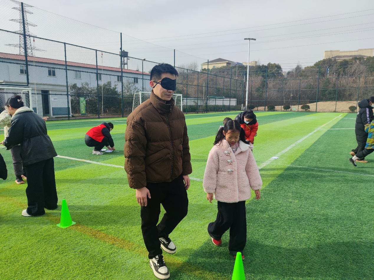 在“信任引前路”环节中,亲子成员两两配合完成“蒙眼指路”任务。一名成员蒙眼前行,另一名成员通过语言进行引导,帮助同伴绕过障碍、安全到达终点。过程中,亲子家庭需要不断沟通、相互信任,在有序参与中体验合作带来的成就感,进一步增强亲子之间的默契与信任。