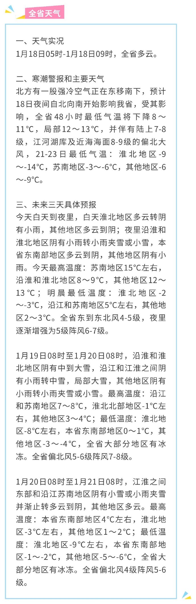【寒潮警报】北方有一股强冷空气正在东移南下,预计18日夜间自北向南开始影响我省,受其影响,全省48小时最低气温将下降8~11℃,局部12~13℃,并伴有陆上7-8级,江河湖库及近海海面8-9级的偏北大风,21-23日最低气温:淮北地区-9~-14℃,苏南地区-3~-6℃,其他地区-6~-9℃。