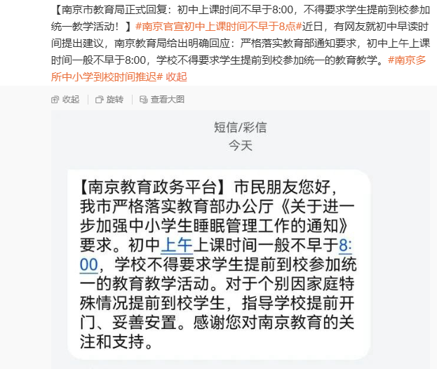 交汇点讯 延迟到校的话题热度不减。1月5日南京多位家长爆料称,接到学校通知:以后7:50-8:00到校,取消统一早读。随后,围绕相关话题的讨论不仅冲上热搜,南京市教育局还于近日统一回复:严格落实教育部通知要求,初中上午上课时间一般不早于8:00,学校不得要求学生提前到校参加统一的教育教学活动。此举被业内人士广泛解读为实行弹性安排,让更多家庭遵照实际进行决定,充分体现了人文关怀。