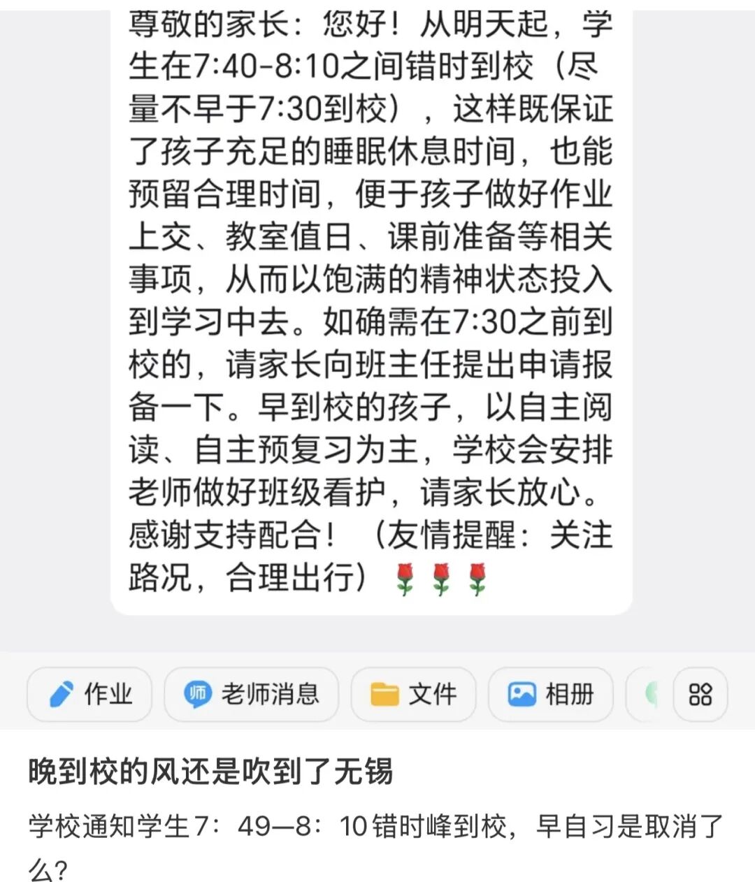 “延迟到校的风”也吹到了无锡。无锡一些学校同样发布相关通知,不再要求学生过早到校,8:00左右为主要入校时间,部分学校8:20前不安排集中教学,早到学生有老师看护,还可到专用教室休息看书。