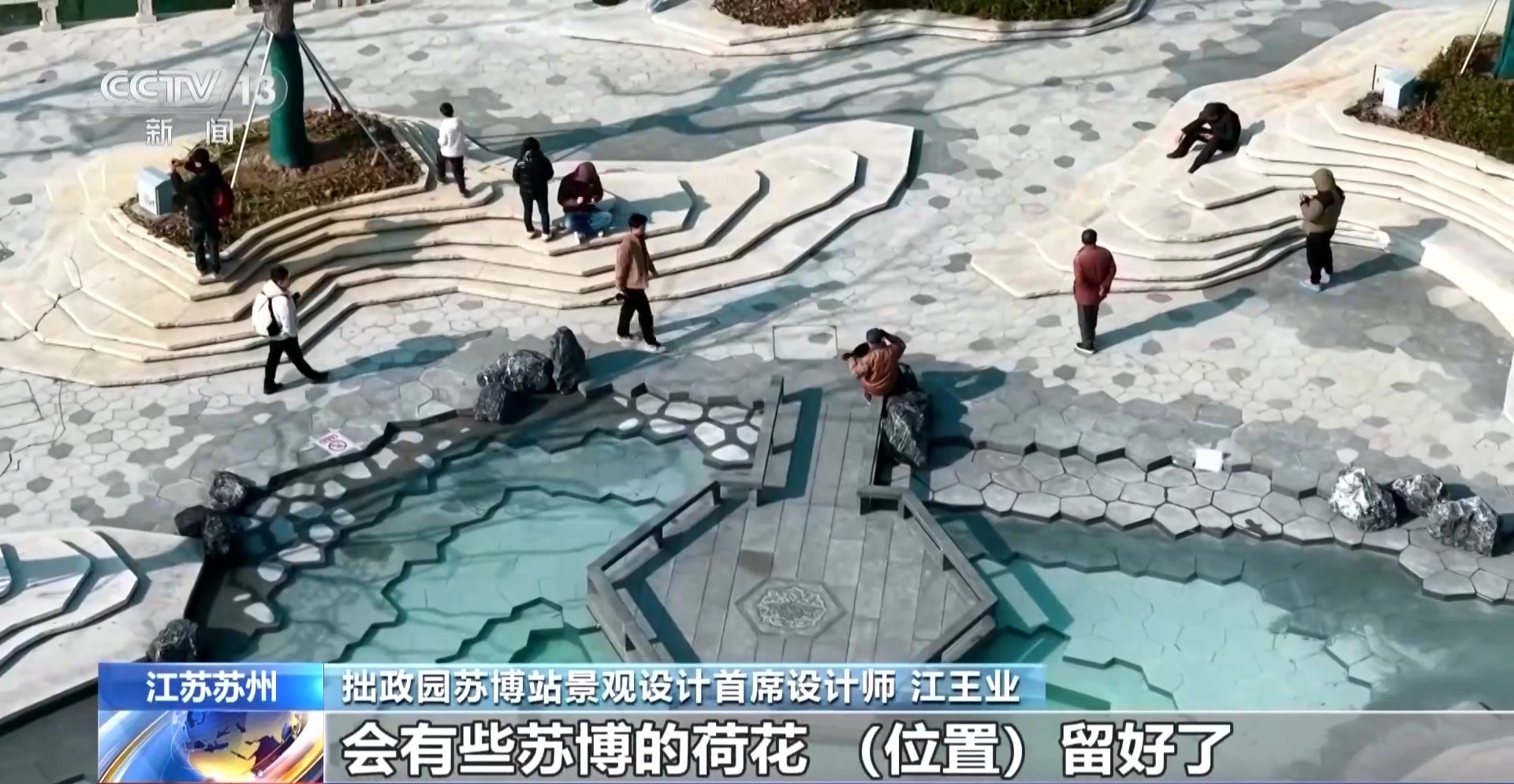 拙政园苏博站景观设计首席设计师 江王业:苏博在设计的时候用了很多三角、框形,尤其在建筑中用一些白描的手法,所以本身它也是一个抽象的园林。包括苏博内部有水系,但是大家一般要走到苏博,排上很长的队,才能看到。所以我们当时就想,一方面希望所有人从地铁出来或经过街边,它都可以很好地把苏博的空间面展示出来。