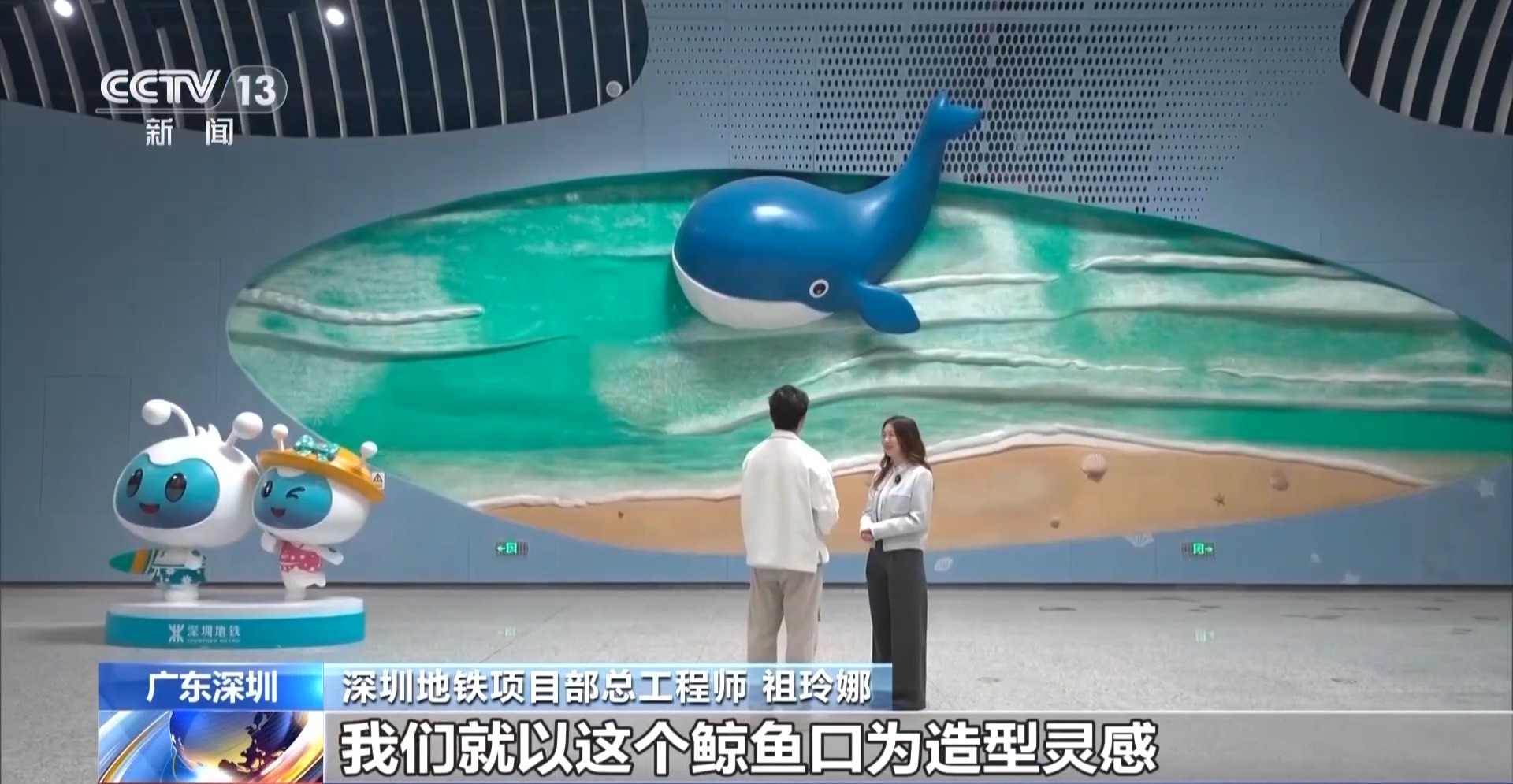 深圳地铁项目部总工程师 祖玲娜:2021年的时候,有一只野生布氏鲸来到深圳海域。我们就以这个鲸鱼口为造型灵感,做了一个出入口,希望人与自然可以和谐共生。