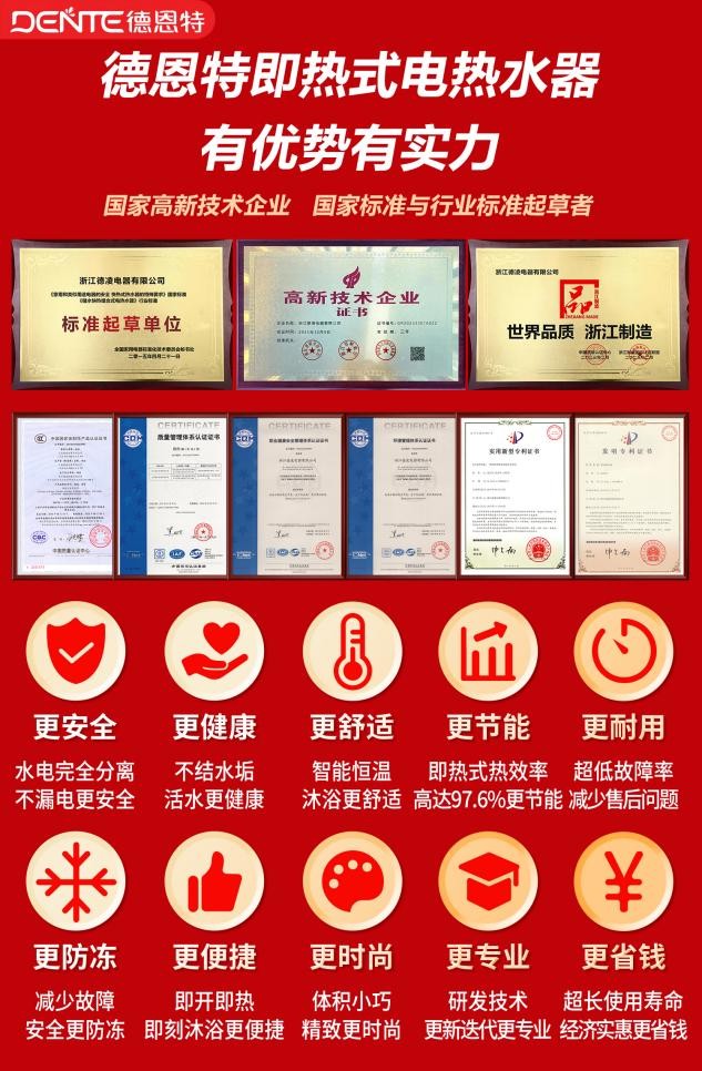 德恩特品牌于2002年将其全球化战略延伸至中国,并成立了专注于快速加热技术的科研基地。2005年,正式成立“德恩特电器”,将全系即热式电热水器产品推向中国市场。品牌深耕“水家电”领域二十余年,现已形成宁波、湖州两大研发生产基地,建立了设计、制造、销售与服务为一体的生产经营网络。德恩特定位为“专业热水解决方案提供者”,产品涵盖即热式电热水器、燃气热水器、小厨宝、净水机等,面向家庭、酒店、学校、医院等多类场所,致力于24小时全天候满足用户热水需求。
