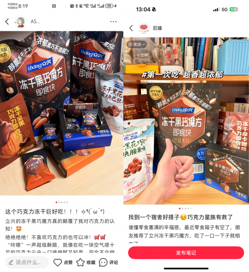如果说行业奖项是专业层面给出的高分,那么在小红书上自然生长的内容,就是市场用真实行为写下的评语。一个品牌是否真的被年轻人接纳,最直观的证明就是看它能否从被动的传播对象,转变为年轻人主动分享的生活主角。立兴冻干没有采用传统的硬广轰炸,而是以#立兴冻干黑巧魔方和#年轻人的轻氧补给站两大话题为引,成功激发了年轻人的创作与分享欲。