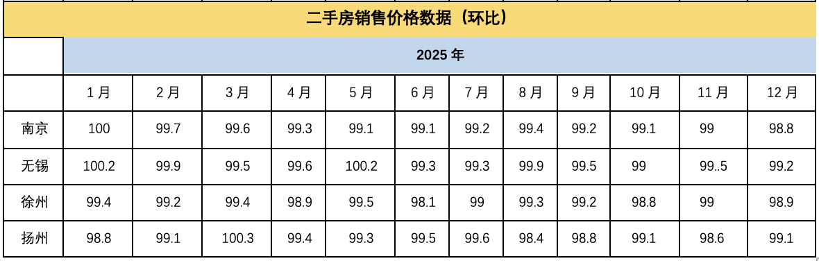 二手房价格方面,四城自今年2月份以来整体处于下降区间徘徊,其间虽有个别月份出现短暂波动回升,但未改变整体调整趋势。12月,南京二手房环比指数98.8、无锡99.2、徐州98.9,均延续下降态势;扬州二手房环比指数99.1,较11月的98.6相比降幅收窄,呈现边际改善迹象。