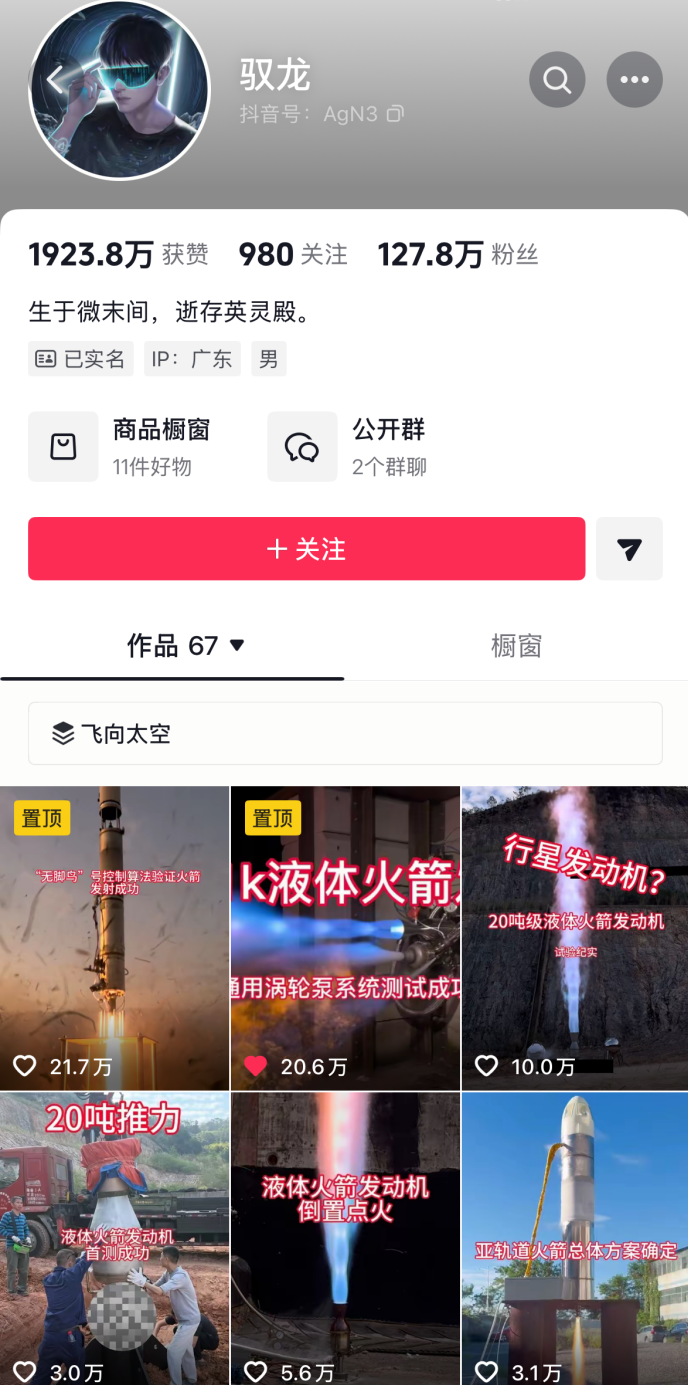 在抖音等平台,卢驭龙凭借百万粉丝量级的账号,持续分享“手搓”火箭发射试验等硬核又接地气的视频科普内容。不同于传统航天科普的严肃,驭龙航天的团队摒弃晦涩的专业术语,擅长用生活化的方式拆解复杂原理 ——从“我们的火箭有什么不同、什么时候发射、票价多少”,到自制液体火箭反推着陆试验,卢驭龙通过镜头记录试验过程,用直白的语言向观众讲清每一步操作的目的、原理与难点。