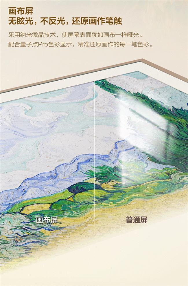 更懂情绪需求的是它的画布屏设计,纳米微晶技术搭配AG防眩技术,能有效抵抗环境光漫反射,再加上自动调节亮暗的环境光感应功能,白天开窗不反光、夜晚关灯不刺眼,无论什么光线条件下,画面都像真画一样柔和清晰。这种舒适的视觉体验,能最大程度减少眼睛的疲劳,让身心都能放松下来。