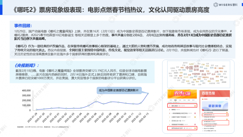 《哪吒2》作为一部经典的IP改编作品,在保留传统哪吒故事核心框架的基础上,通过大胆的人物和情节改编,成功地将传统神话故事与现代社会情绪相结合,实现了传统文化的现代表达。热议内容层面,全网社媒主要围绕中国电影、传统文化、视觉效果等相关话题进行讨论。2月19日,央视新闻也对《哪吒2》进行了报道,关注历史性的全球高票房及影片在海外多个国家获得的票房和高度评价。